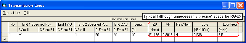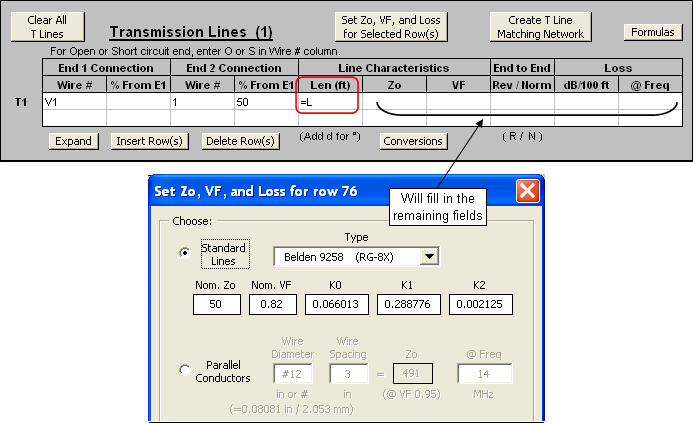 If you have AutoEZ you can do everything at once, plus calculations for multiple line lengths, plus let Excel do all the math. Create the wire(s) for your model, put a 1 amp current source at V1, then define a transmission line with End 1 at V1 and End 2 at the antenna feedpoint. Set the length using a variable, "=L" in the illustration below. Then click the "Set Zo, VF, and Loss" button. Select from the list of approximately 100 built-in line types or set the wire diameter and spacing for custom parallel conductor line. When you click OK the remaining fields for the transmission line will be filled in.