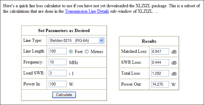 A JavaScript calculator with a dropdown list of 47 different transmission lines and an input box for SWR at the load end of the line was developed by the author in 2001 as part of the web page documentation for an Excel application called XLZIZL. This is what the original looked like.