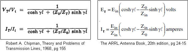 Yet another method is convenient if you also want to calculate the current and voltage at either end of the line. The lower formulas below calculate the current at the load (termination) based on the current at the input; on the left using the impedance at the load, on the right using the impedance at the input.
