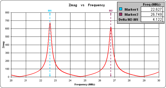 Or is it? If you had started your sweep at 1 MHz the first two Zmag peaks would occur at 2.045 and 6.153. That's a half-wavelength difference of 4.108 MHz which translates to a physical length of 79.011 feet. On the other hand, if you had started your sweep at 90 MHz the first two Zmag peaks would occur at 92.738 and 96.864. That's a half-wavelength difference of 4.126 MHz which translates to a physical length of 78.667 feet.