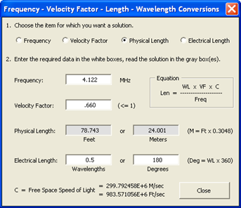 "Calculator: ..." button near the bottom of the window. (In this case you aren't going to do any "adding" or "subtracting" of transmission lines. It's just that the"Calculator: ..." button is found there.)Choose "Physical Length" as the value you want. Enter whatever frequency difference you got from the marker table, in this example 4.122 MHz. Set the velocity factor to that of the line in question (0.66 in this case) and make sure the electrical length is set to 0.5 wavelengths. Presto, the length of the line is 78.743 feet.