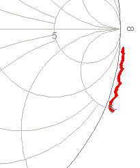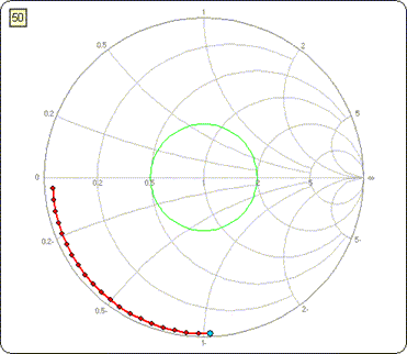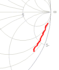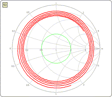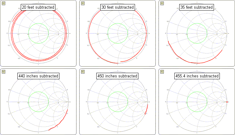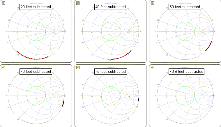 In this example the final length was set at 78.6 feet. The following "time lapse" shows what the Smith chart would look like with varying amounts of transmission line subtracted.