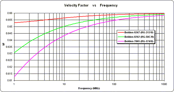 The problem is that the velocity factor changes with frequency, as the above chart shows for three different types of coax all having a "nominal" VF of 0.66. For all three the VF approaches 0.66 at very high frequencies. At lower frequencies the amount of change in velocity factor is dependent on the internal inductance of the cable conductors (center conductor and outer shield). The internal inductance is related to the resistance of the conductors. And the resistance of the conductors is related to the loss of the cable. The greater the cable loss (that is, the higher the attenuation in dB/100 ft) the more the VF will change at lower frequencies.