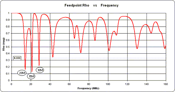 (20-15-10 meter) Yagi. The frequency sweep is from 1 KHz to 160 MHz. A reference line at rho value 0.333, which corresponds to an SWR of 2:1, has been added. The 20 meter, 15 meter, and 10 meter bands have been marked. You can see that although the reflection coefficient magnitude exhibits a very complicated pattern, at most frequencies the value is relatively high. Hence at most frequencies most of the incident pulse energy will be bounced back.