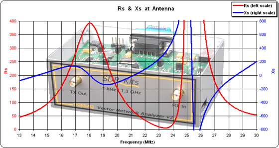 For example, you could do a sweep at the input end of the transmission line from 13 to 30 MHz to cover the range of the tri-band Yagi used in this example. Load the data file into Zplots, subtract the appropriate length of line, and then plot resistance (Rs) and reactance (Xs). By noting where the blue Xs trace crosses zero you can determine the resonance points for the antenna. And, if you like, you could add something to the background as a reminder of how the line length was determined.