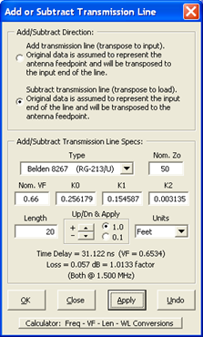 Note: If you change the K1/K2 coefficients be sure to make a note of the new values. That way you can use the same values when you re-attach the line to the antenna, make measurements with the antenna in place, and then again "subtract" the correct amount of line in order to see just the response of the antenna itself. When you make changes to any of the characteristics for the built-in line types those changes are not saved once you close the dialog panel. On the other hand, any changes you make to the characteristics for the "User Specified" line are saved and will be shown the next time you use the dialog.
