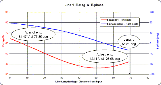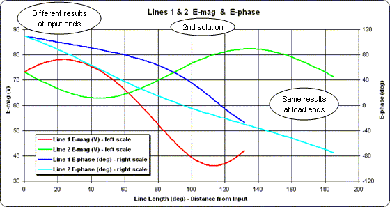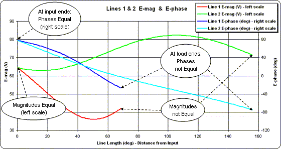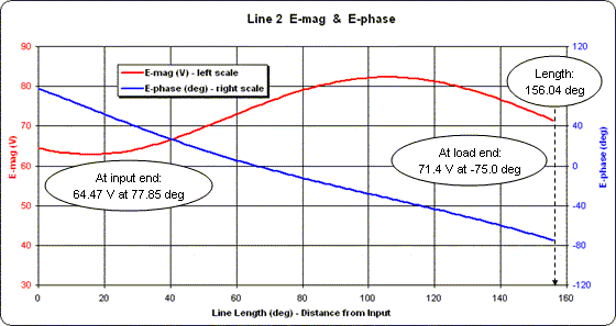 Repeating the process for Line 2 as shown below (this time with the X axis spanning 0 to 160 degrees) yields a completely different looking set of traces for voltage magnitude and phase. But notice that the conditions at the input end of Line 2 are exactly the same as at the input end of Line 1. Hence the lines may be joined together at that point.