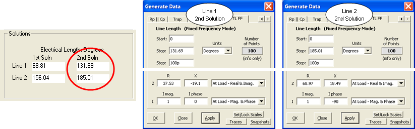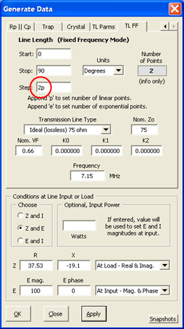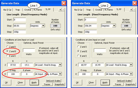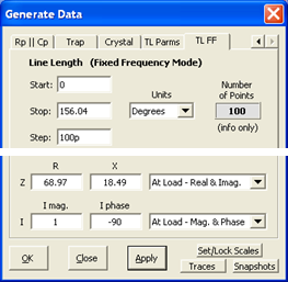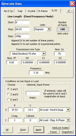 At left is the Zplots "TL FF" (Transmission Line at Fixed Frequency) Generate Data setup for Line 1. The entries in the top portion (namely a section of 75 ohm line that is 68.81 electrical degrees in length) correspond to the values from the Arrayfeed1 program. The entries in the bottom portion (impedance of