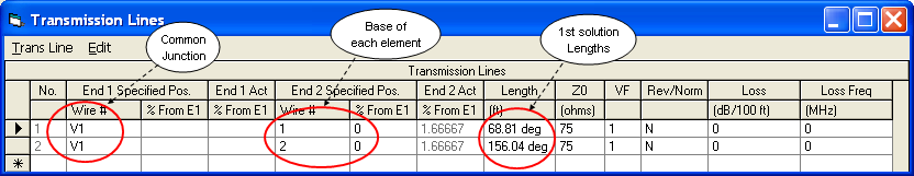 This example also uses a "virtual segment" (V1) at the common junction. Virtual segments are a feature of EZNEC v.5. If you have an earlier version of EZNEC just use a very short wire that is positioned at some point between the two antenna elements.