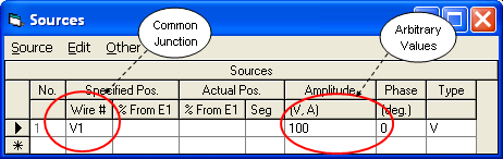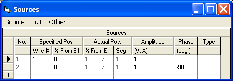 Now it's time to change the EZNEC model by deleting the two ideal current sources, adding two transmission lines, and adding a single source at the common input ends of the transmission lines. In actual operation the magnitude of the voltage and current at the common junction would depend on the power supplied by the transmitter. For modeling purposes any value will do. In the example below a voltage source of 100 V at 0 deg has been arbitrarily chosen.
