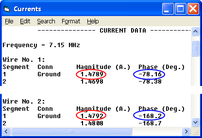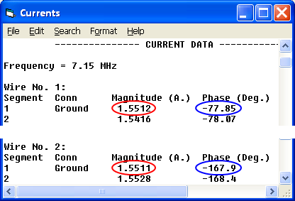 To verify correct operation take a look at the EZNEC "Currents" window. The current magnitudes (circled in red) at the base of each element are virtually equal. The phases (circled in blue) differ by the desired amount, with element 2 lagging by 90° compared to element 1.