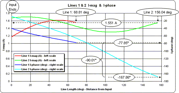 The current magnitudes (red and green traces, left scale) have the same value at the load ends of the lines, as desired. The current phases (dark blue and light blue traces, right scale) differ by the desired 90 degrees.