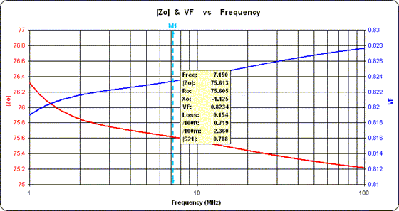 As the frequency decreases, notice how the Zo magnitude (red trace, left scale) rises from its "nominal" value of 75 ohms while the velocity factor (blue trace, right scale) drops from its nominal value of 0.83.