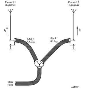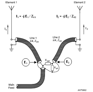 This alternate feed method is shown at left in an illustration from The ARRL Antenna Book (Fig 17 on pg 8-19 of the 21st edition, with additional annotation added). The L network, consisting of series reactance Xser and shunt reactance Xsh, provides a desired ratio between voltages E1 and E2. The action of the "current forcing" transmission lines then reproduces this same ratio in the currents at the base of the respective elements, assuming Z01 equals Z02.