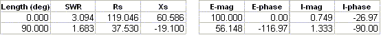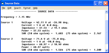 Note that if either element were operating independently the source impedance would be approximately 54+j0 ohms, a combination of 36 ohms radiation resistance and 18 ohms of ground loss. Because of the mutual coupling between the elements the two source impedances differ from this value, and because the elements are driven 90° out-of-phase the source impedances differ from each other.