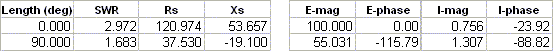 100 / 75 orEin / Zo ) and the phase of the load current lags the input voltage phase by 90°. The load impedance of37.53-j19.1 plays no part in the calculations.On the other hand, if you had specified a "real" line such as the "Lowe's Home Center RG-6 CATV" (which from actual measurements is similar to Belden 9116) as follows:
