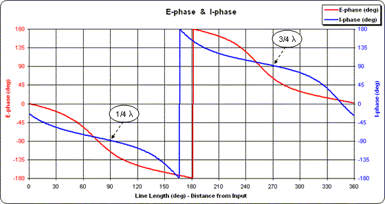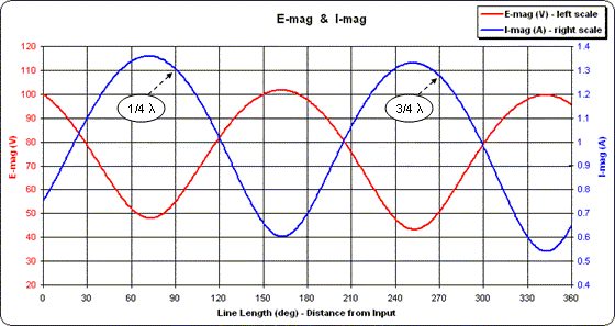 At the load end of the line (towards the right) notice that the values for the voltage magnitude (red trace) and voltage phase (blue trace) match those shown by EZNEC for source 1 at the base of element 1. Following both traces to the left (towards the input end of the line) you can see how the magnitude and phase change.