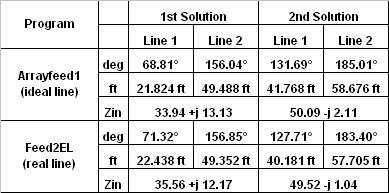 You can take this analysis of "real world" lines a step further if desired. Arrayfeed1 assumes ideal (no loss) lines and scalar values for Zo such as 75 ohms. I was curious to see what the effect would be of using lines that have both loss and a complex Zo so I created the Feed2EL Excel workbook. The partial screen grab at left shows the results and here's a summary of the findings: