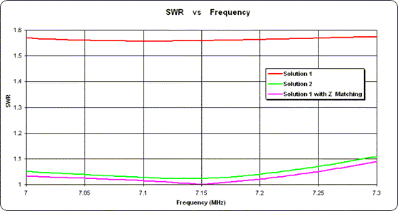 Sure enough, the SWR for solution 1 (red trace) is fairly flat across the entire band. Solution 2 (green trace) is not quite as flat but (in this case) shows lower overall values. And although either one would be entirely acceptable in practice, just for illustration I added a simple impedance matching network between the solution 1 junction point and the main feedline. The SWR response for that combination is shown as the magenta trace.
