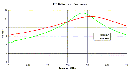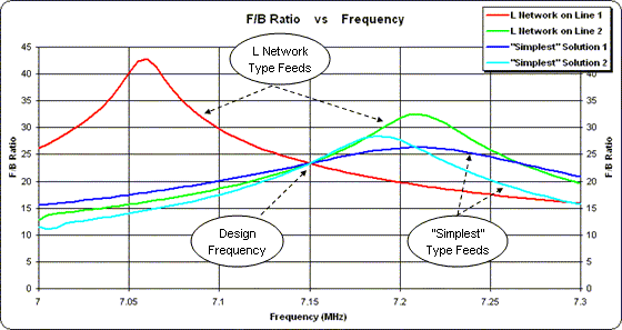 As was the case with the "simplest" solutions, there is a distinct difference in the F/B ratio pattern when a sweep is done over the entire 40 meter band. However, at the design frequency of 7.15 MHz the F/B ratio is exactly the same in all cases which verifies that the designs were done correctly.