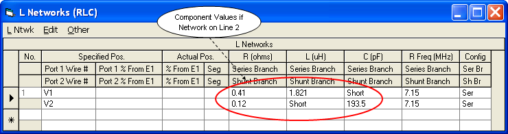 As with the "simplest" feed system it's probably not a good idea to make a decision based solely on the SWR value. Instead you might want to look at the reactance values for the L network components. For example, the screen grab at left shows the values when the L network is placed ahead of line 1 and below are the values if the network is placed ahead of line 2.