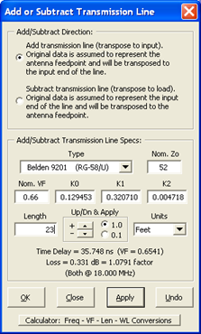 - When adding or subtracting a transmission line, the time delay and loss (at the mid-point of the frequency range) are automatically computed and shown. This may be of interest to users of other software when dealing with transmission lines.