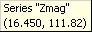 When you hover the mouse pointer over any data point on the Custom XY chart a small "Chart Tips" box will appear. The first line in the box will show the name of the item being plotted, such as Zmag or Theta. (Different versions of Excel may show additional information.) The second line will be in the form (xx,yy) where xx is the frequency at that point and yy is the data value.