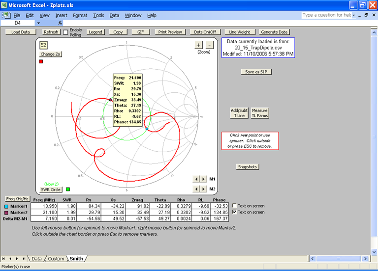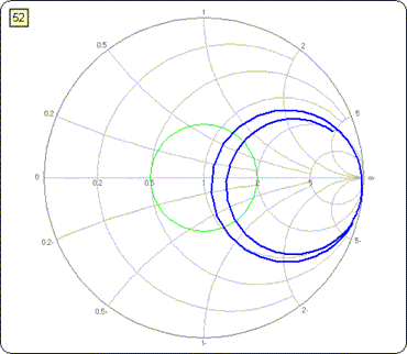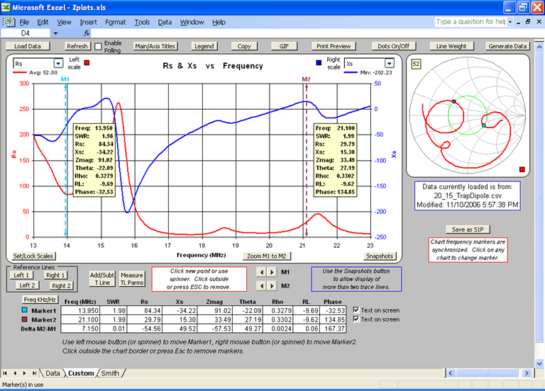 A Mini-Smith chart is shown on the same sheet with the XY chart. To see both the XY chart and the Mini-Smith at the same time you must have your screen resolution set to 1024x768 or higher and you must maximize both the Excel window and the workbook sub-window (using the lower set of size buttons). Alternatively, on the Excel menu you can select View | Zoom and choose a magnification level less than 100%.
