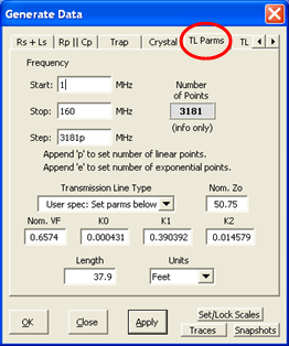 - New "TL Parms" tab under "Generate Data" added to generate transmission line (TL) parameter data based on mathematical models. May be used stand-alone or as a way to compare with measured data.