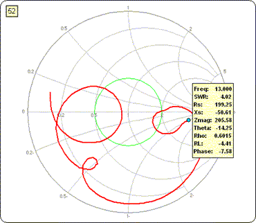 On the (large) Smith chart, a similar box will appear showing the R±jX value for the point under the cursor, but you must click on the chart border first under all versions of Excel. Also note that this feature is not available on the mini-Smith chart, only on the large chart on the Smith sheet tab.